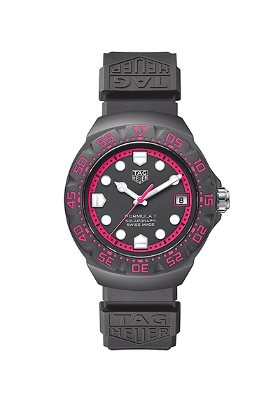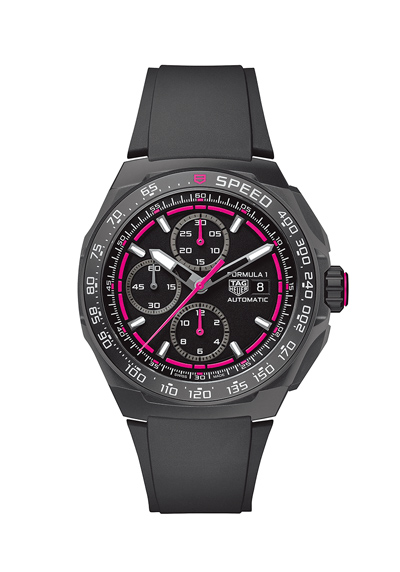 擔任F1賽事官方指定計時的泰格豪雅也在卡達夜賽同步發表兩款Formula 1螢光粉限量版腕表,分別是計時碼表和太陽能Solargraph腕表,兩款腕表皆採用黑色與鮮豔螢光粉色的對比色系,大膽的黑粉配色釋放鮮明張力,充滿賽車運動的動能活力,同時呼應卡達賽事夜間炫目賽道的特色。