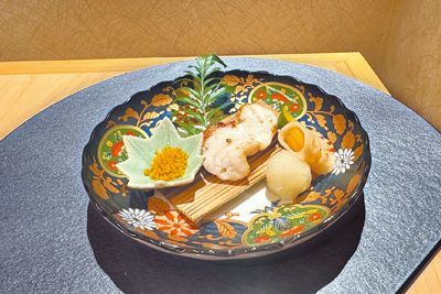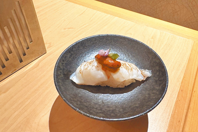首先上桌的「九繪魚煮凍」,晶瑩凝脂中封存魚肉甘香並以魚子醬點綴,充滿奢華感;主菜前以「炙燒九繪魚壽司乘北海道生海膽」來讓味蕾甦醒,炙香魚肉與海膽甘潤交融,細膩馥郁,令人回味無窮。