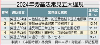 據職安署統計,2024年全國勞動條件勞動檢查共實施3萬6823場次,違反場數達7822場、開罰逾3.5億元,而21.24%的違反率創下近7年新高,其中最常違反的條文是「加班費」、「薪資未全額給付」等。