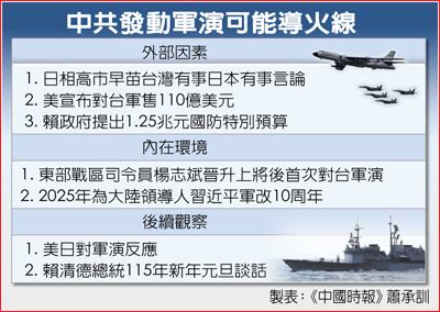 淡大外交與國關學系助理教授陳奕帆指出,今年2次重大軍演,皆與賴政府觸碰現狀有關。此次是北京對賴政府將採購1.25兆元軍備的回應,自11月底宣布採購後,北京即伺機而動,尋求反制;12月中又適逢東部戰區更換新司令員,此次軍演亦是解放軍展現隨時可戰的姿態。
