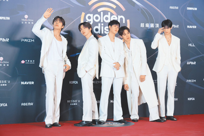 韓國第40屆金唱片頒獎典禮10日下午在台北大巨蛋舉行,紅毯環節上星光熠熠,許多組女團選擇以款式隆重的禮服亮相,如IVE成員們均以白色與銀色為主軸,一方面讓團體具有高度一致性,但在細節上做出區別,團員Rei和Gaeul選擇穿戴TASAKI的balance step系列珠寶;張員瑛和Liz則以寶格麗珠寶點綴。