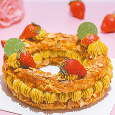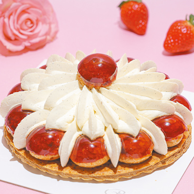 「草莓聖安娜泡芙」則是以焦糖酥皮與焦糖泡芙堆疊香草香緹、草莓醬與鮮草莓,展現正宗法式經典。另有適合分享的「草莓塔」、口感香酥的「草莓千層酥」與充滿過年意象的「草莓元寶」等品項。