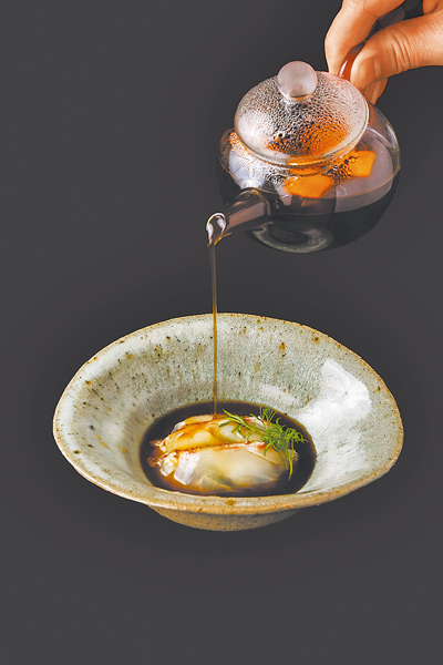 最適合冬天的暖湯,則是主廚招牌「真鯛搭配蕈菇澄清湯」,九州真鯛以生魚片形式呈現,搭配季節時蔬大豆苗、白玉蘿蔔、蘑菇與糯麥,澄清湯以魚高湯、牛肝菌與柑橘熬製而成,風味深邃而清澈,先品嘗湯品原味再與底層食材一同享用,充分感受日本、台灣與法國風土的交融。