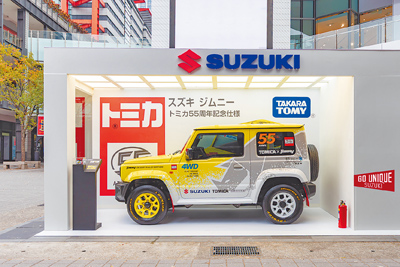 TAIWAN SUZUKI表示,此次展演以經典紅白配色玩具盒為設計靈感,將真實比例的Jimny置入巨大模型包裝中,彷彿一輛「被放大的夢幻玩具車」。展示車外觀更是透過泥濘飛濺的圖案來象徵Jimny的越野性能與侵略感,並採用前後不同色輪圈營造出躍入大自然的動感氛圍。同時在細節上,融入SUZUKI S標誌、Tomica品牌Logo、TOMICA 55週年紀念標誌,以及致敬歷代Jimny的圖案。