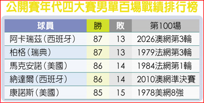 22歲的阿卡瑞茲絕對是網壇「年少有成」的代表,昨天是他生涯在大滿貫的第100場男單比賽,獲87勝超過自己的同胞前輩「蠻牛」納達爾(如附表)。而擁有史上最多四大賽24冠的喬柯維奇,生涯大滿貫頭100場拿79勝,「瑞士特快車」費德勒80勝,阿卡目前主要敵手辛納則是81勝,起步都略遜一籌。