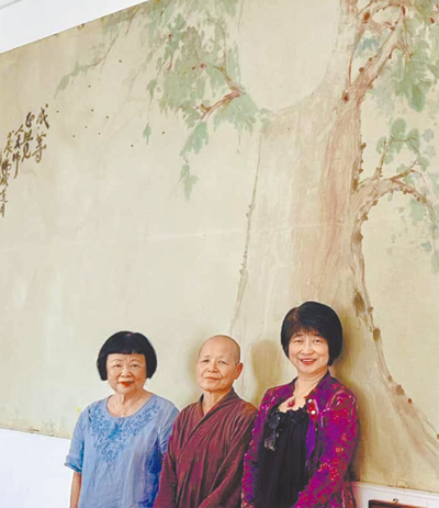 我驚喜極了!這幅是曉雲法師三十七年前1988年畫的,在台北成立大學辦事處時,布置了佛像,她作此畫,掛在佛像後面的牆上作為背景。當時近三十位弟子撐起畫布,她站著揮毫,兩小時一氣呵成。畫上沒有佛像,只有明亮的圓光和巨大的菩提樹。我走向般若堂中間,站在中央線上,看見那尊白色佛陀坐像的頭,正框在圓光之中,佛陀背後的菩提樹,枝葉向外伸延,生意盎然,周圍雲霧濛濛。這幅畫本在山上,為溼氣所損,觀法師找到台南藝術大學的修護團隊把它修復,2016年舉行修復揭幕儀式。