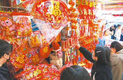 以「台灣年味在台北」為主題的迪化商圈年貨大街,結合街區文化、商圈串聯與大型抽獎活動,讓民眾不只是買東西,也能感受節慶氣氛。圖為店家準備各式年節商品供試吃選購,現場湧入滿滿人潮,增添濃濃年味。(圖文:王英豪)