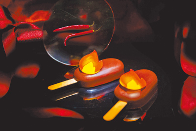 「魔幻巧刻」雙人下午茶中的「茉莉白桃柚子白巧克力慕斯」,以杏仁蜂蜜蛋糕與巧克力脆片鋪底,堆疊清甜白桃果泥凍與帶有果香風味柚子奇想巧克力奶醬。另一款「孟加里巧克力冰淇淋」則是以帶有些許莓果香氣的64%孟加里巧克力製成冰淇淋,內餡包裹酸甜的覆盆子果泥與新鮮草莓丁;冰淇淋中巧妙加入微量朝天椒辣粉,苦甜中帶有辛香氣息,外層再裹上瓜那拉巧克力脆皮,口感層次豐富,令人玩味。
