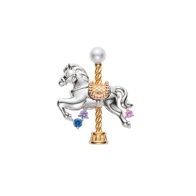 MIKIMOTO馬年旋轉木馬胸針是以白金、黃K金和粉紅金打造,白金馬身閃耀奢華、姿態優雅,黃K金打造的立柱上鑲有一顆日本Akoya珍珠,馬足上綴有三顆粉紅、藍色和紫色的藍寶石,充滿了夢幻甜美感,由於旋轉木馬有著「時來運轉」的意象,加上金馬不斷向前奔馳,每一次轉動代表告別過往,奮力向前,為新年更添幸運吉祥。