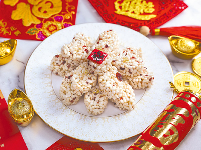 JR東日本大飯店台北點心坊主廚黃伯欽帶來升級版的傳統米香,呼應農曆春節氣氛。主廚提醒這道甜點最關鍵的地方在於熬煮糖漿的過程,必須要注意火侯,溫度太高,糖漿容易燒焦;溫度太低則無法產生黏稠感,所以熬煮糖漿是關鍵步驟。