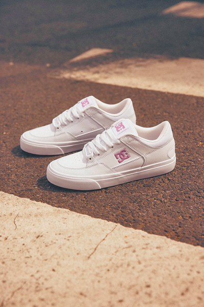 同時,DC SHOES也推出ONYX女生鞋款版本,主視覺以白底搭粉紅Logo呈現,並針對女性腳型微調鞋楦與包覆感,延續鞋款核心的舒適與機能性。