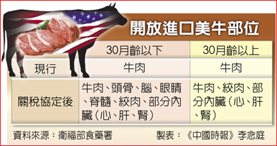台美完成對等貿易協定簽署,擴大開放全齡美牛絞肉、心、肝、腎,及30月齡以下牛腦、頭骨、眼睛、脊髓可輸入;牛豬產品萊劑殘留容許量,也將對齊國際標準,豬腎萊劑容許量恐放寬。專家批評,政府在年假前直接宣布開放,令民眾措手不及,萊劑為非必要用藥,恐讓體質較弱民眾承擔風險。