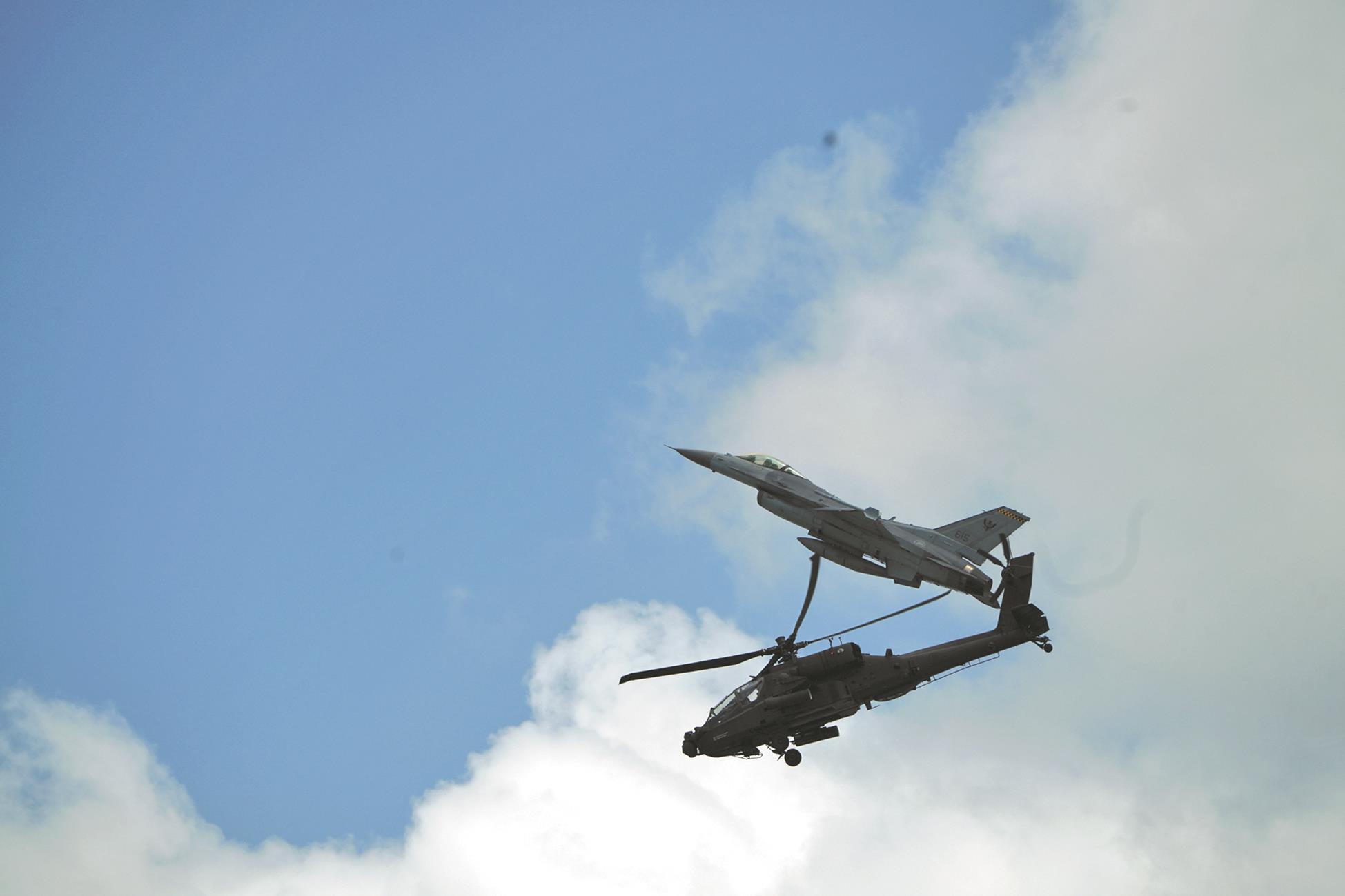 地主國新加坡以快速F-16戰機搭配慢速AH-64D直升機做動態性能展示。(陳國銘提供)
