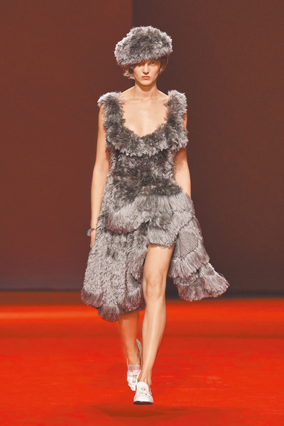 材質運用同樣令人印象深刻,從毛絨羊毛、捲曲羊剪絨到刷毛編織絲綢,建構整個溫暖、柔軟的視覺、觸覺體驗,不過所謂的柔軟並非單指面料,而是整體穿著體驗,以廓形舉例,蓬鬆與圓潤是本季重點輪廓,品牌標誌性的Intrecciato編織在大衣上透過裁片細節重新演繹,性別界線被淡化,輪廓與身體自然互動,展現跨越年齡與性別的穿衣思考;而Louise Trotter標誌性的玻璃纖維羽毛打造的靈動流蘇與露肩設計,在本季更強調建築般的立體結構,讓柔軟與結構並行。