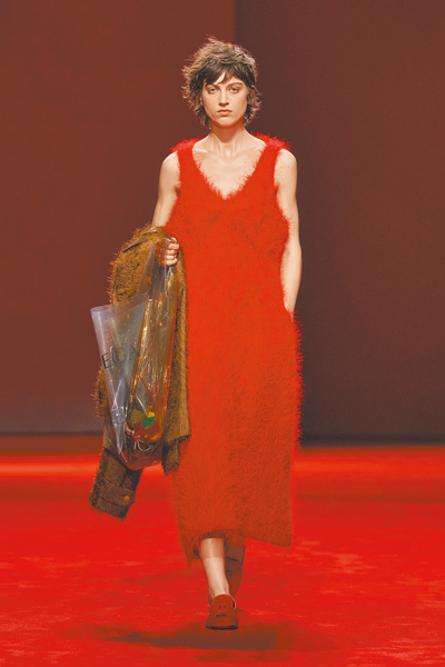 配件方面,各式帽款在秀場上存在感強烈,包款方面,則有毛茸茸的巨大手拿包,令人記憶猶新,當然品牌經典標誌性的intrecciato編織皮革包也存在感十足,不過若回到台灣氣候條件,實穿度最高、最具市場潛力的,或許是半月形手袋與銀色頸鍊,而那個印有品牌字樣、裝著許多intrecciato編織小玩意兒的透明袋子,則是記者私心認為讓秀上造型能夠連結到日常生活的MVP。