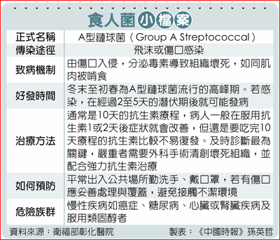 彰化醫院小兒科主任馬瑞杉指出,A型鏈球菌被視為喉嚨殺手,主要攻擊人體的黏膜和皮膚軟組織,嚴重者更會侵犯到肌肉或軟組織的筋膜,變成蜂窩性組織炎,甚至壞死性筋膜炎,因而得名「食人菌」。農曆過年後有增溫之勢,人潮聚集空間就可能透過飛沫傳播,絕不能輕忽。