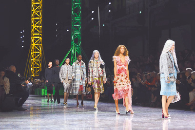 綜觀本季大秀現場,不難發現許多充滿創意的元素,展場空間延續巴黎大皇宮一貫的宏偉格局,結構鋼架被打造成如工業裝置般的幾何舞台,黃、紅、綠光束交織其間,模特兒在鏡面般的地面上行走,彷彿置身一場光影流動的裝置藝術。藝術總監Matthieu Blazy在本季提出一個頗具詩意的命題:毛毛蟲與蝴蝶。透過生物的蛻變隱喻,也回應了品牌創辦人Gabrielle Chanel所留下的務實浪漫精神,既貼近生活又帶著幻想。