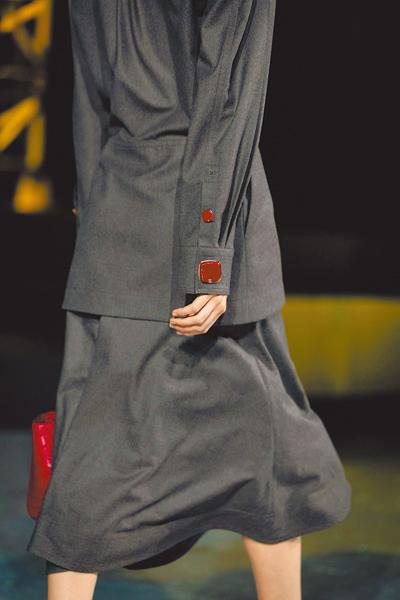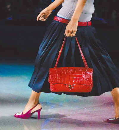 秀場上另一個吸睛細節,是紅色元素的穿插。從腰帶、鈕扣到包款,深紅色皮革與漆面質感在整體自然色調中形成強烈對比。其中一款鱷魚紋口蓋包Souplissimo搭配黑色百褶裙造型,並以同色系腰帶與跟鞋登台,呈現出更俐落的都會氣質。