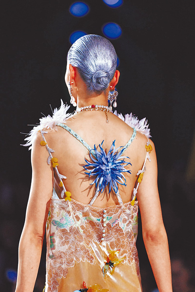 當夜幕降臨,秀場的氛圍逐漸轉向更夢幻的一面,絲緞質地在燈光下泛起虹彩光澤,薄紗禮服與羽飾細節讓模特兒行走時宛如蝴蝶振翅。部分晚裝更在背部裝飾立體花卉或珠寶元素,使整體造型多了幾分戲劇張力。這種從白天到夜晚的轉換,也正是本季「蛻變」主題最直接的呈現。