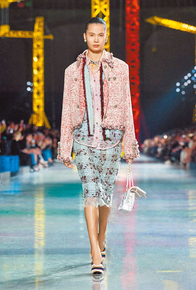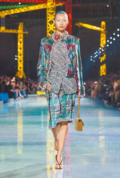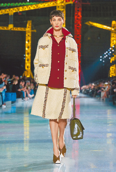 本季系列彷彿一段橫跨時代的旅程。設計語彙從1920、1930年代的輕盈剪裁出發,經過1950與1960年代的輪廓演變,再回到當下。貫穿整個系列的主角,仍是香奈兒標誌性的斜紋軟呢套裝。經典元素被重新拆解後重組:羅紋針織、圈圈紗軟呢、Lurex金銀絲與天然薄紗交織出層層紋理,甚至加入矽膠與合成纖維,讓傳統面料呈現近乎科技感的質地。部分套裝更以珠飾工藝重新處理,使整體結構看似厚重卻意外輕盈,行走時隨身體律動。