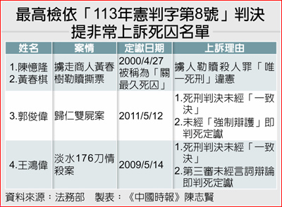 王鴻偉是繼黃春棋、陳憶隆、郭俊偉3名死囚後,最高檢依據憲法法庭「113年憲判字第8號」判決,第三度提起非常上訴的第4名死囚。