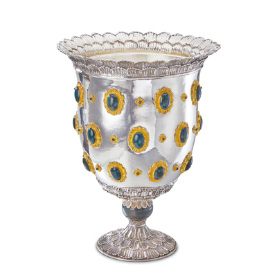 另有Doge系列銀器家飾,包括桌面擺飾、花瓶、燭台與相框等,將青金石、孔雀石、紅玉髓與Osmena珍珠嵌飾其中,將珠寶鑲嵌的浮雕(repousse)與鏨刻(chasing)技術工藝融入家飾作品中,猶如雕塑藝術品。