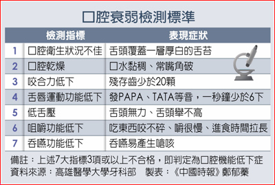 高雄醫學大學附設醫院牙科部長杜哲光表示,過去民眾以為老了咬不動很正常,事實上,這並非老化自然現象,除和牙周病有關,另一主因是口腔肌肉不足、舌頭肌力下降,無法把食物推至咽喉,長輩多無病識感,其實已經進入失能前期。