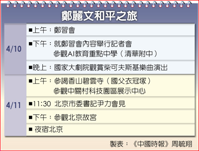 鄭麗文11日預計展開在北京的參訪行程,第一站先前往香山碧雲寺,這裡是國父孫中山衣冠塚所在,鄭麗文將前往參謁;接著則會到中國大陸國家級高新技術產業開發區的「中關村」參觀最新AI技術的應用;中午北京市委書記尹力邀請鄭麗文一行午宴,下午則會參觀北京著名觀光景點的「故宮」。