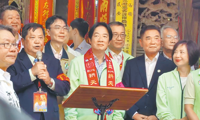 賴清德率先在傍晚5時現身山邊媽祖宮,隨後再轉往拱天宮,包括民進黨祕書長徐國勇及南投縣長參選人温世政、台中市長參選人何欣純、苗栗縣長參選人陳品安、彰化縣長參選人陳素月、新北市長參選人蘇巧慧都陪同到場。