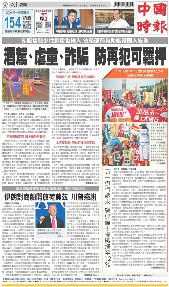 AD AD 停權卻贏初選惹議 蕭敬嚴退選 台企聯將換屆 廈門韓螢煥擬接會長 伊朗對商船開放荷莫茲 川普感謝 五一遊行訴求 勞退雇主提繳增至12% 酒駕、虐童、詐騙 防再犯可羈押