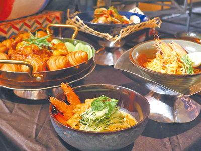 近20款大馬風味料理和甜點輪番登場,替「遠東Cafe」自助餐檯增色不少,設計菜單的雙廚也大方分享自己喜愛的家鄉味料理,包括平民美食「檳城蝦麵」、馬來西亞風味的咖哩雞和來自檳城的娘惹甜點「摩摩喳喳」、大馬傳統早餐「咖椰吐司」,都是身為馬來西亞人的行政主廚陳勇偉推薦必吃的大馬風美食。另有街頭靈魂美食「羊肉沙嗲佐自製花生醬」、國寶級美饌「新加坡辣椒蟹」、口感酥脆彈牙的「麥片炒虎蝦」等,讓饕客一站吃遍道地南洋美饌。