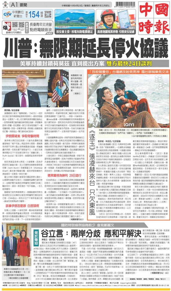 核安會主委:核電有助電價穩定 高德地圖精算秒數 引發資安疑慮 免於脅迫 谷立言:兩岸分歧 應和平解決 《逐玉》張凌赫來台 只欠東風 川普:無限期延長停火協議