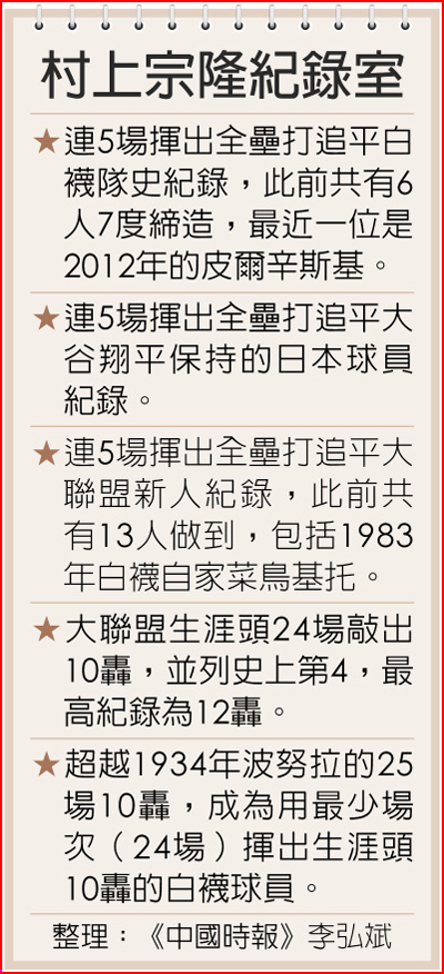 村上的大聯盟生涯就以連3場開轟起步,但隨後陷入13戰1轟、打擊率1成19的低潮,當外界覺得這位東瀛打者「果然不行」的時候,他用追平隊史跟大聯盟菜鳥紀錄的連5場開轟「打臉」看衰者,也成為隊史最快10轟(24場)的打者。儘管白襪昨以7比11不敵蛇軍,「村神」的紀錄仍是最大焦點。