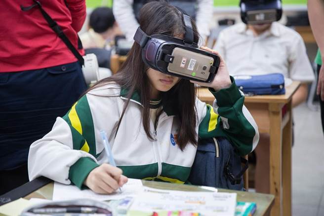 許庭毓老師說,未來的教室風景,是能給孩子更多的探索機會,VR科技是最好的媒介,將情境、感官與知識連結成有意義的學習。 大有國中建置全班30套的行動式VR裝置,也有提供學生課餘時間學習的遊戲式互動VR設備,課堂中透過老師的引導,學生帶上頭戴式裝置,進入VR的虛擬世界」。