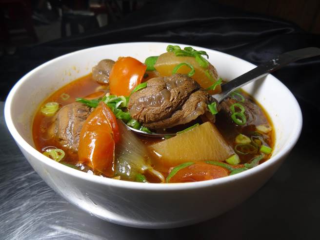 其中牛肉麵特別選材美國牛肉製作,光是牛肉成本就比澳洲牛肉貴上許多,牛肉切塊後湯頭則是以蔥、薑、洋蔥、白蘿蔔、紅蘿蔔、蕃茄等辛香料和蔬菜一起熬煮,完全不加糖和味精,牛肉香嫩可口、軟而不爛,湯頭帶著蕃茄酸香,就連白蘿蔔、紅蘿蔔都是又甘又甜,清爽好吃。