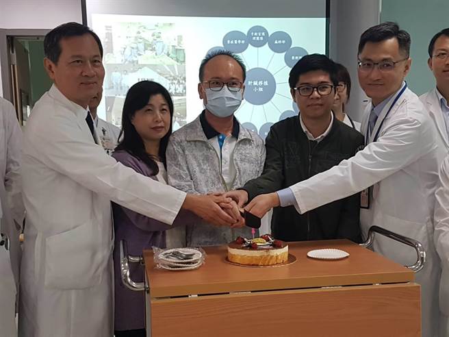 林姓患者與家人及醫療團隊開心切下生日蛋糕,林父感謝兒子捐肝給他,他的兒子表示,當時覺得父親等待肝臟捐贈遙遙無期,乾脆自己換肝給爸爸,如今看見父親重拾健康,感到相當開心。