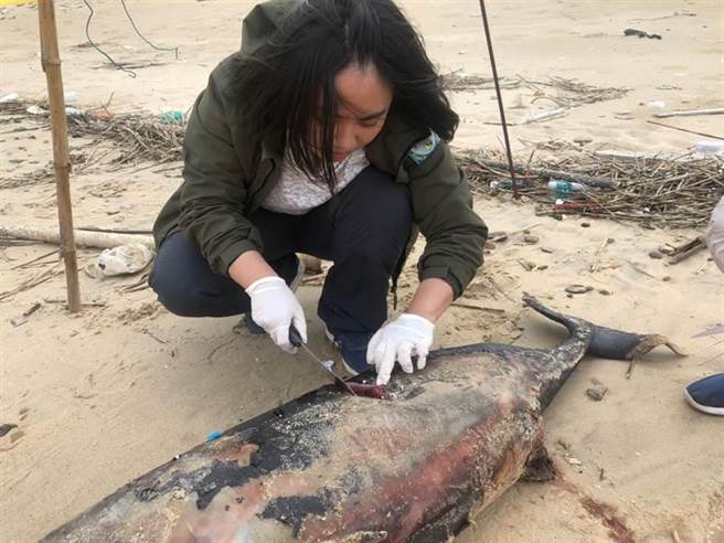 保育員比對圖鑑確認又是江豚, 體長約126公分,寬約26公分,已是即將生長成熟的個體。因已嚴重腫脹及腐爛,在完成檢體採集後就地掩埋。