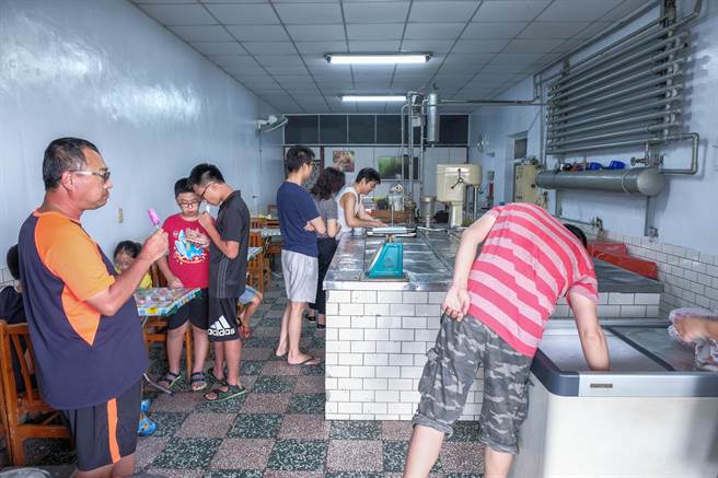 勇勝冰果店在竹北市西區開店有40多年,一進店可看到傳統製冰機器,運用液態氨在冰排中冷卻的效果製冰,製作古早味的冰棒、冰淇淋和冰沙,假日都吸引不少熟客上門。