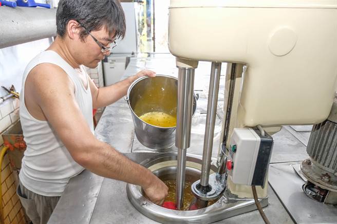 勇勝只做百香果、鳳梨和酸梅3種冰沙,張永彬說,百香果是用新鮮原汁,鳳梨則是整顆去皮後打成果汁,酸梅則用醃製好的梅子,加上白砂糖放入冰沙機攪拌,完全不加任何色素或香料,經過製冰器的冷卻,大約20分鐘可做好1桶30斤的冰沙。