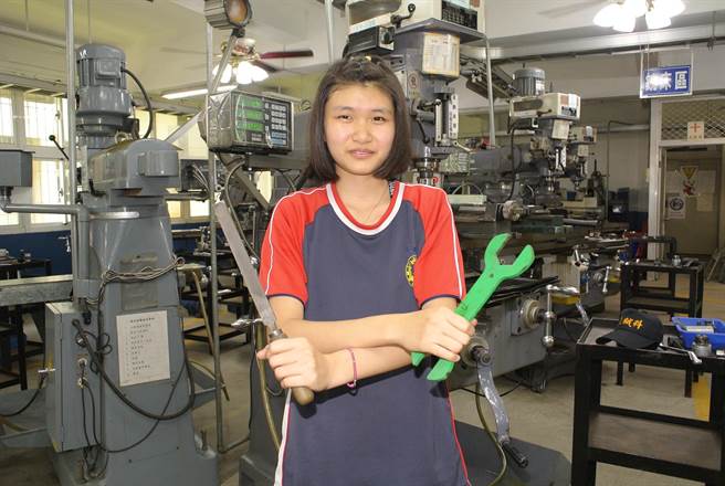 身高160公分的紀翊琪,體重只有42公斤,纖細的體態很難與機械科有所聯想,但她一戴上護目鏡、保護帽,手拿扳手、剉刀,氣勢馬上為之一變,神情專注地操作銑床、車床、鉗工等機具,在剛硬的機械世界中非常引人注目。