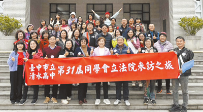 楊瓊瓔則辦理清水高中第31屆同學會,邀請40位高中同學參訪立法院,來場暌違43年的校外旅行。她表示,這份長達半世紀的緣分,就像她對台中的情感一樣,禁得起時間考驗,更越陳越香;她深信自己是一個好的領導者,更具備把大家「凝聚在一起」的能力,她會把這份對老朋友的真心,化為照顧每一位台中市民的動力。