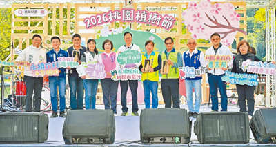 115年度桃園市植樹節活動14日在龍潭區三坑生態公園登場,市長張善政攜手多家知名企業代表種下台灣欒樹、流蘇等喬木及數種灌木,並在活動現場展示國產木材課桌椅,盼共創節能減碳種子。