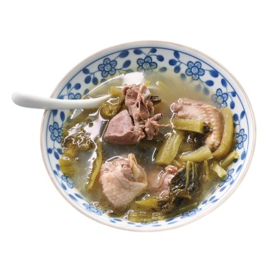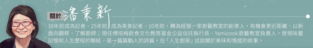 有趣的是,庄裡有朋友為了鼓勵她,採取逆向操作的方式,開賭局賭她得不到名次,也就是說,她要贏才能拿到賭金,儘管朋友們知道她實力堅強,但第一次就奪冠,也確實太超乎大家的想像了。結果劉雪玲贏到好幾萬元賭金,豪氣地請大家吃了好幾攤,其中有一頓就是她親自做出贏得比賽的客家宴客菜。也因此,朋友建議她開餐廳,十年來,劉雪玲以父母之名經營的「阿戊嫂の店」,發光發熱、聲名遠播,阿戊是她父親的小名,鄰居都叫她的母親阿戊嫂。 從租店面到三年前完成夢想,投注她所有積蓄及跟銀行貸款,斥資兩千萬元買 一百四十坪的地蓋房,把三代同堂的四個套房和她的大廚房、餐廳全結合在一起。當她努力解決蓋房的種種困難時,丈夫有來關心:「他最後還是有幫我,給了我一筆退休金!」但沒多久,丈夫就突然病故了,劉雪玲為他辦了隆重的喪事,盡了當妻子最後的責任。 如今,一到假日,阿戊嫂の店經常高朋滿座,母親、媳婦、女兒、同學會一起來幫忙,劉雪玲時而在廚房揮鏟、時而出來和客人聊天,充滿活力又熱情。 聽她述說這些往事,看到她的孫兒在庭院玩耍,我突然有股莫名的感動,她的菜就是承載著經歷和情感,才具有這麼獨特的魅力啊! 至於廚藝教學方面,十月的第一堂課,當「福菜苦瓜封」溫潤如玉的苦瓜切開來,內餡福菜的香氣散出,當「梅乾扣肉」油亮彈Q、梅乾菜香氣四溢,從蒸籠端出來時,學員無不「哇!」地發出讚嘆聲。加上十一月教客家紅糟的紅糟香,前幾天教「客家鹹湯圓」做的油蔥酥,置身其中、聞著香氣、享受美味,無怪乎學員頻頻高呼:「真是太幸福了!」 今天人生廚房就在這蔥油香、酸菜香、梅乾菜香等客家經典香氣中,和大家道別,祝大家二○二一心想事成、牛轉乾坤,再見嘍!