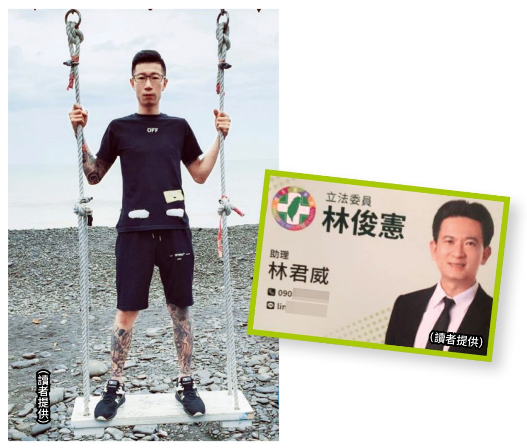 林君威是民進黨立委林俊憲的台南服務處助理。林俊憲是副總統賴清德的子弟兵,曾任民進黨發言人、三屆台南市議員,以及兩任立法委員,政治歷練豐富,不僅形象佳,問政口碑也不錯;近日林俊憲還化身網紅,拍攝影片《開箱國會》,介紹各黨派立委同僚辦公室、推薦台南美食等,獲得許多迴響,外傳他正為了角逐下屆台南市長積極布局。 本刊調查,只要林俊憲現身台南,林君威幾乎都隨侍在旁,然而,就在主子處於前線吃緊時,林君威卻後方緊吃,大享齊人之福陷入桃花劫。 家住台東的小兔說,去年(二〇二〇年)四月間,她在網路遊戲《大老闆》認識林君威,雙方聊了幾次後相約見面。碰頭當天,小兔開車遠赴台南,兩人愈談愈投機,不久便陷入熱戀,後來幾乎每個周末假日,小兔就上演「百里追愛」的戲碼。 只是,多次小兔一到台南呼喚情郎時,林君威老說自己周末更忙,實在無法見面。「我當時只要問起他(林君威)的職業,他總是含糊地說自己是服務業。後來我一再追問,他才傳給我一張陪同林俊憲跑攤的照片,表示自己是林俊憲的助理。」