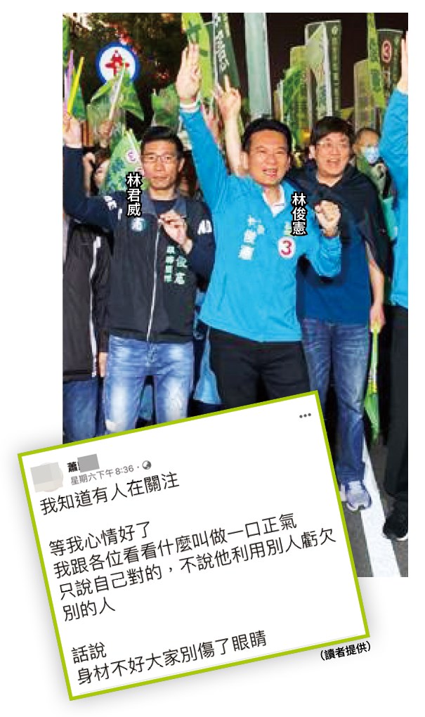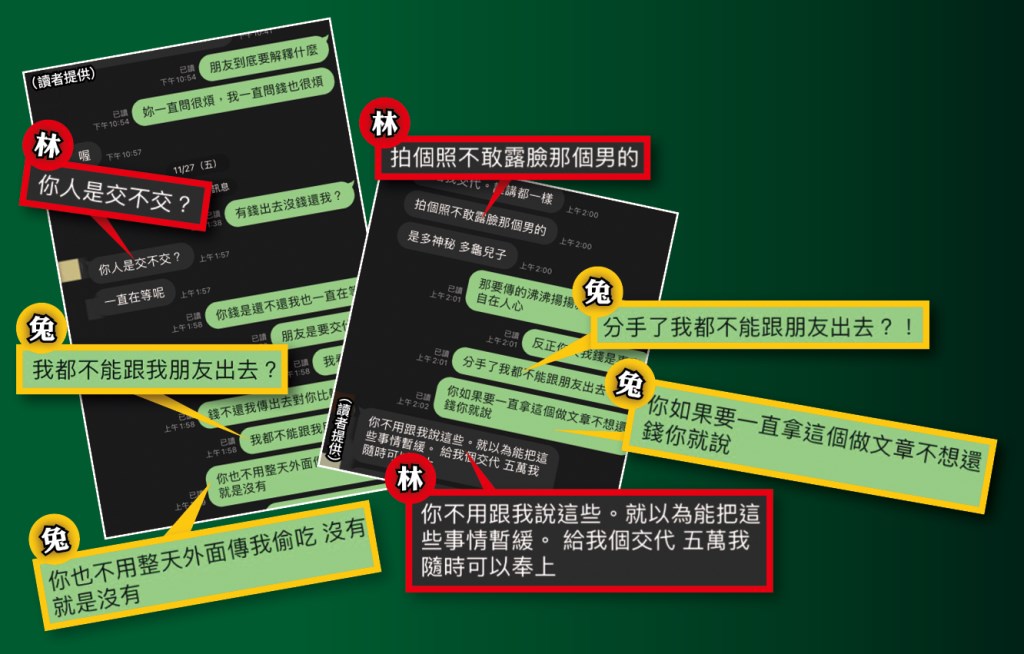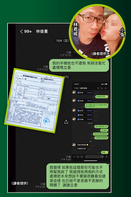 此外,「去年(二○二○年)六月二十二日,他(林君威)突然開口向我借五萬元,說自己二○一七年間涉入一起詐欺案,必須繳納十八萬元的罰金,若再不繳清,就會被抓去關,不過身上真的沒有多餘現金。」小兔說自己又心軟,就匯錢到林君威的個人帳戶,「我們雖然沒有簽下任何借據,但他(林君威)承諾日後一定會還錢。」 三個月後,林君威搬出前女友又向小兔借四萬元,「他(林君威)說他的前女友想要成全我們,決定搬出去住,然而他實在沒錢資助,只能向我求救。我實在不忍心一個女孩子在外沒錢,又拿出四萬元。」這一次,小兔要求簽借據,卻遭到林君威砲轟一頓,「他(林君威)認為我不給他面子,強調他以人格擔保,前女友會還錢,最後證實根本就是在胡扯。」 「我後來無意間從他(林君威)的小孩口中得知,他早就打算與前女友復合,才驚覺自己被利用。」小兔決定斷捨離後,去年(二○二○年)十一月底向林君威提出分手,同時開始追債,孰料,林君威只承認自己借的五萬元,卻完全否認曾經代替前女友借四萬元,「他(林君威)還造謠說我劈腿,更揚言要找黑道教訓我,強調他在立委辦公室工作,沒有他怕的事!」