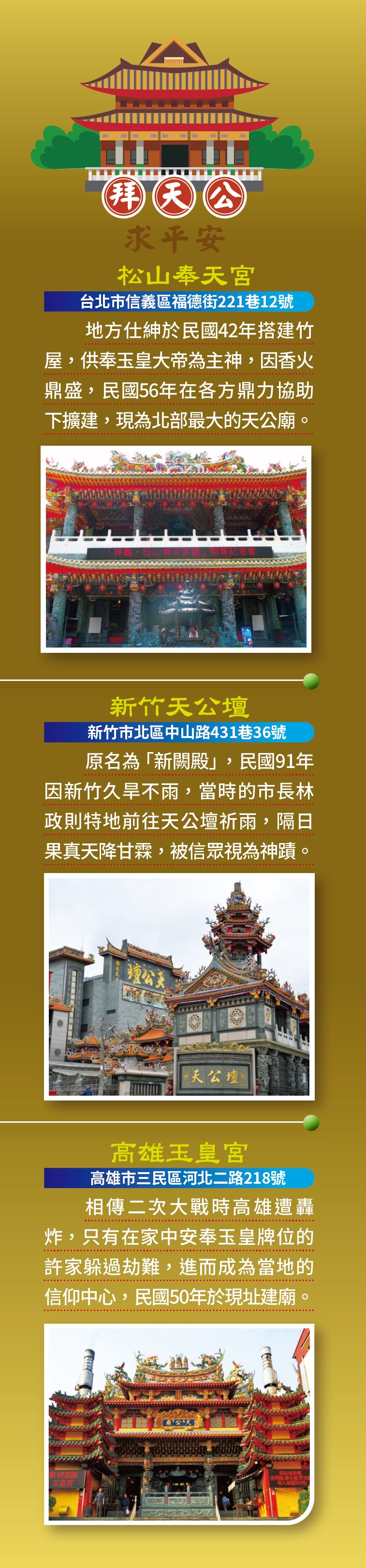 玉皇聲威遠播屢現神蹟,信徒們都深信不已,陳愛娥表示,她的先生在大陸上海投資燈具事業,一直有回台做內銷的打算,但直到今年一月獲得玉皇同意後才付諸行動,「後來就爆發新冠肺炎,生意躲過疫情的衝擊,感覺冥冥之中,祂幫我們做了最好的安排。」陳愛娥說。 原為學校教授的無極宮義工陳青田也告訴本刊:「我原是職業軍人,面對一成不變的人生,有了繼續讀書的想法。」儘管身邊沒有人支持,在玉皇大帝的保佑下,他順利拿到博士學位,並在學校執教鞭十幾年,退休後就到無極宮擔任義工,回報玉皇恩澤。 無極宮於民國五十四年建立於現址,陳愛娥回憶,五十年前當地發生土石流,廟公一度遭到掩埋,陳愛娥的母親不斷地向玉皇祈求,才成功將廟公救出。為感念玉皇庇佑,陳愛娥的母親花了十五年,將原先只有一層樓的廟宇,改造成三層樓的雄偉建築,至今無極宮已是中和地區弘揚道教的聖地。 農曆十二月二十五日,是玉皇出巡考察人間善惡的日子,民間會燒香誦經,又稱為「迎玉皇」。陳愛娥特別提醒,由於玉皇茹素,信眾可用新年應景的糖果、水果及桂圓茶來敬奉。
