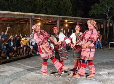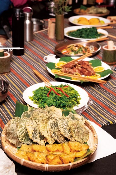 黃昏時分,廣場中央的營火炊煙裊裊,部落媽媽以巧手將苧麻和當季的野菜結合,做成美味料理。秋冬之際,可品嘗當季脆又甜的柿子做開胃涼菜、炸苧麻葉及香酥可口的地瓜,另外,以苧麻葉搭配獨特醬料包覆五花豬蒸製,更是下飯。瞧瞧一旁的大鍋爐,燒著苧麻根、樹豆與排骨熬煮的一鍋美味熱湯,每一道料理都能看見苧麻的身影,填飽大夥們的肚腹。
