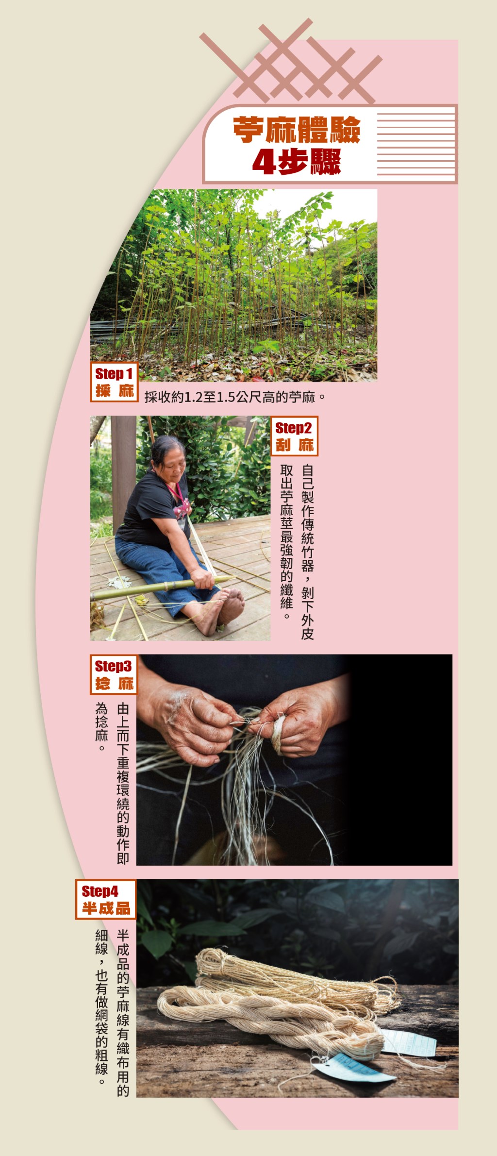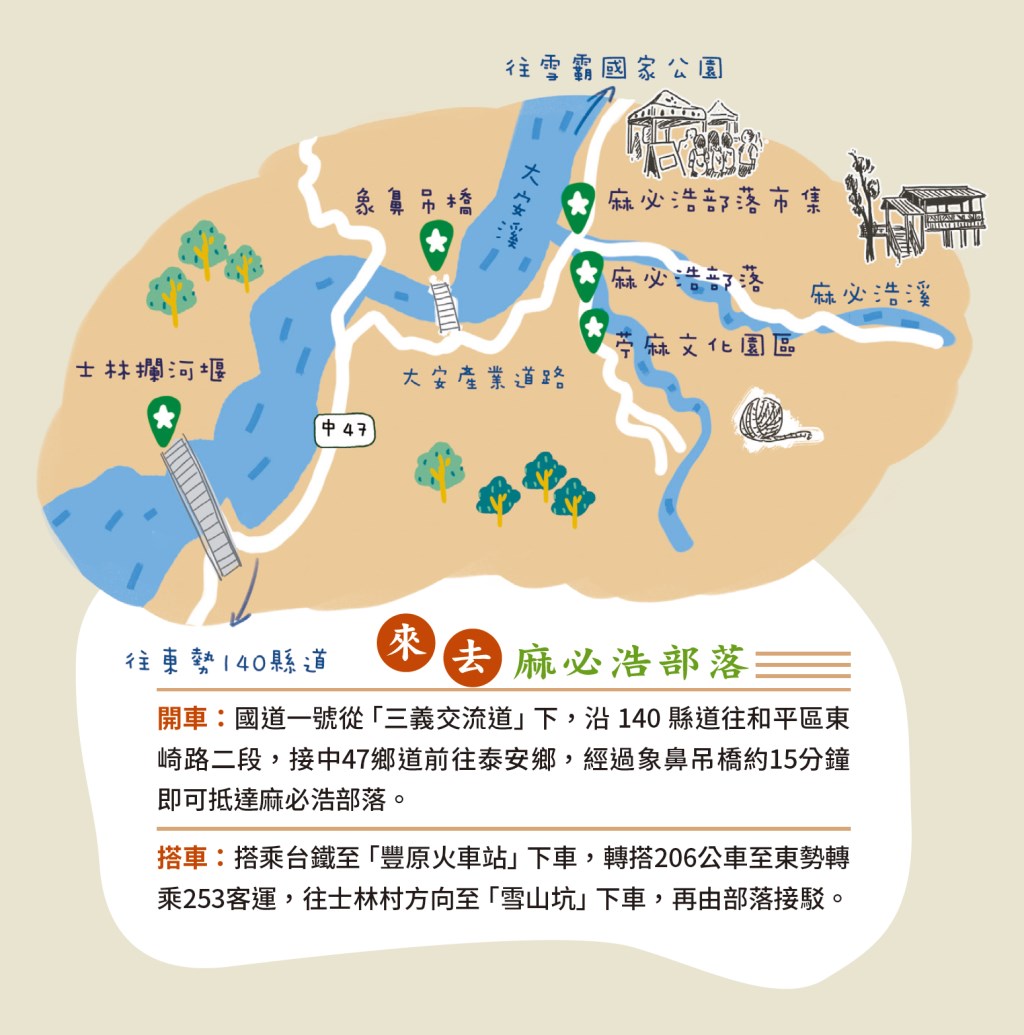 前有大安溪、後有麻必浩溪環抱的麻必浩部落,第一代頭目啦必浩將此地取名為「麻必魯浩社」,台灣光復後再改名為麻必浩。不料,民國五十二年該處遭葛樂禮颱風洪水沖失、一戶不留,居民認為麻必浩字意不祥,恐有麻煩必大之意,因而申請改名為「永安社區」,有永順安樂之意。 近年部落積極尋根,用回原本的名字麻必浩,重新種植苧麻、尋回製線技藝,並成立「線藝師」認證,一如由大地破土而出的苧麻般,也讓塵封多年的文化破繭。 重拾苧麻編織技藝,部落也找回自己的生命觀。在泰雅族傳說中,離世的族人會回到彩虹橋,透過歷史文獻、耆老口傳,在麻必浩部落文物館展示的大型壁畫,呈現了麻必浩的婦女死後靈魂將回到苧麻莖裡面,猶如祖靈通過一針一線的織布過程,繼續溫暖著後代子孫;男人則會回到竹管,像是搭建起的竹屋、竹製武器守護家園。 首站來到苧麻文化園區,展示了頭目達利帶領族人一起製作的藤橋模型,見證早年為了跨越大安溪至象鼻部落,必須使用藤橋過河的歷史,幾近失傳的搭建藤橋技術,深具傳承意義,也開放讓遊客親自穿越體驗。 園區內的苧麻田,除了可以親自採摘,也能跟著「刮麻師」利用傳統竹器,將苧麻剝皮、取莖後,留下中間最強韌的纖維,再從部落耆老布滿皺紋的雙手接過纖維,隨著「續麻師」示範如何積麻、搓揉、捻出細線。族人不時熱情分享苧麻和部落之間的故事:「女人出門就在肩上掛著苧麻,邊走邊捻線,回家就是完好的一捆,她們負責織出全家人的衣服;男人用較粗的纖維搓成繩子,做出狩獵陷阱、漁網,或是網袋等生活器具。」男獵女織分工合作,脫離不了苧麻,後續還要曬乾、染色到編織成布,過程相當繁複,織布只是一隅,更重要的是,麻必浩的族人們織出共同的生活記憶。