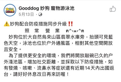 位於新北市新店區永興路上的「Good Dog妙狗寵物游泳池」(妙狗泳池),標榜泳池用水來自烏來新店溪的「天然山泉水」,並會定期消毒清潔,由於飼主和毛小孩可以一起下水玩樂,因此吸引許多「親子團」,且一待就是整個下午;園區開幕至今已多次登上媒體,甚至被封為「毛小孩必去消暑勝地」。 今年全台缺水又遇上疫情亂入,泳池業者都被迫停業,妙狗泳池卻絲毫不受影響,五月中疫情大爆發之際,業者還在臉書官網宣布「防疫措施同步升級,照常營業」;六月間有網友在臉書官網留言詢問「有開嗎?」業者也回答「有」。面對疫亂當頭,業者卻還開門做生意,附近不少鄰居都相當擔憂妙狗泳池恐會成為疫情破口。