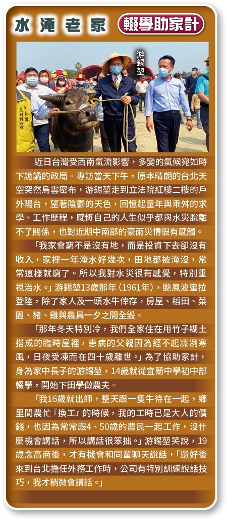 民進黨在野時,不時批評立法院猶如行政院的「立法局」, 如今行政院在閣揆蘇貞昌的強勢領導風格下, 彷彿時光倒流,重現昔日民進黨口中「立法局」的荒謬。 有「水牛伯」之稱的立法院長游錫堃, 接受本刊專訪,首度對此表態, 他以當年擔任閣揆「抗SARS」成功的經驗為例, 強調唯有行政院與立法院相互溝通與合作,方能化解各種危機, 行政院應傾聽立委反映的基層民意,政策才可以更趨完善, 對照蘇貞昌內閣紓困振興政策如今陷入朝野非議, 頗符合「以人為鏡,可以明得失」之喻。